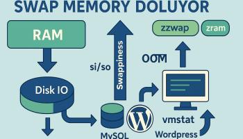 Swap alanının hızla dolması, sunucunuzda RAM baskısı, yanlış yapılandırma veya süreç sızıntılarına (memory leak) işaret edebilir. Bu rehber; nedenleri açıklar, adım adım teşhis sunar ve kalıcı çözümleri (swappiness ayarı, swap alanını büyütme, zswap/zram, servis ayarı) verir.